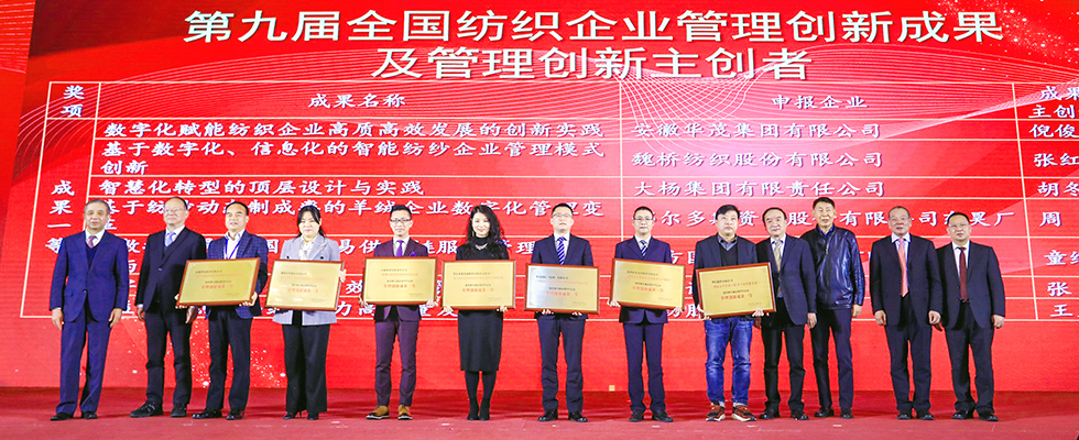 中国企业家年会上,中国纺织工业联合会副会长夏令敏对全国纺织企业管理创新成果和全国优秀纺织企业家评选情况进行介绍,并宣读《关于发布推广第九届全国纺织企业管理创新成果及管理创新成果主创者的决定》。诺邦股份《数字化改造融合驱动高效生产管控》荣获第九届全国纺织企业管理创新成果一等。