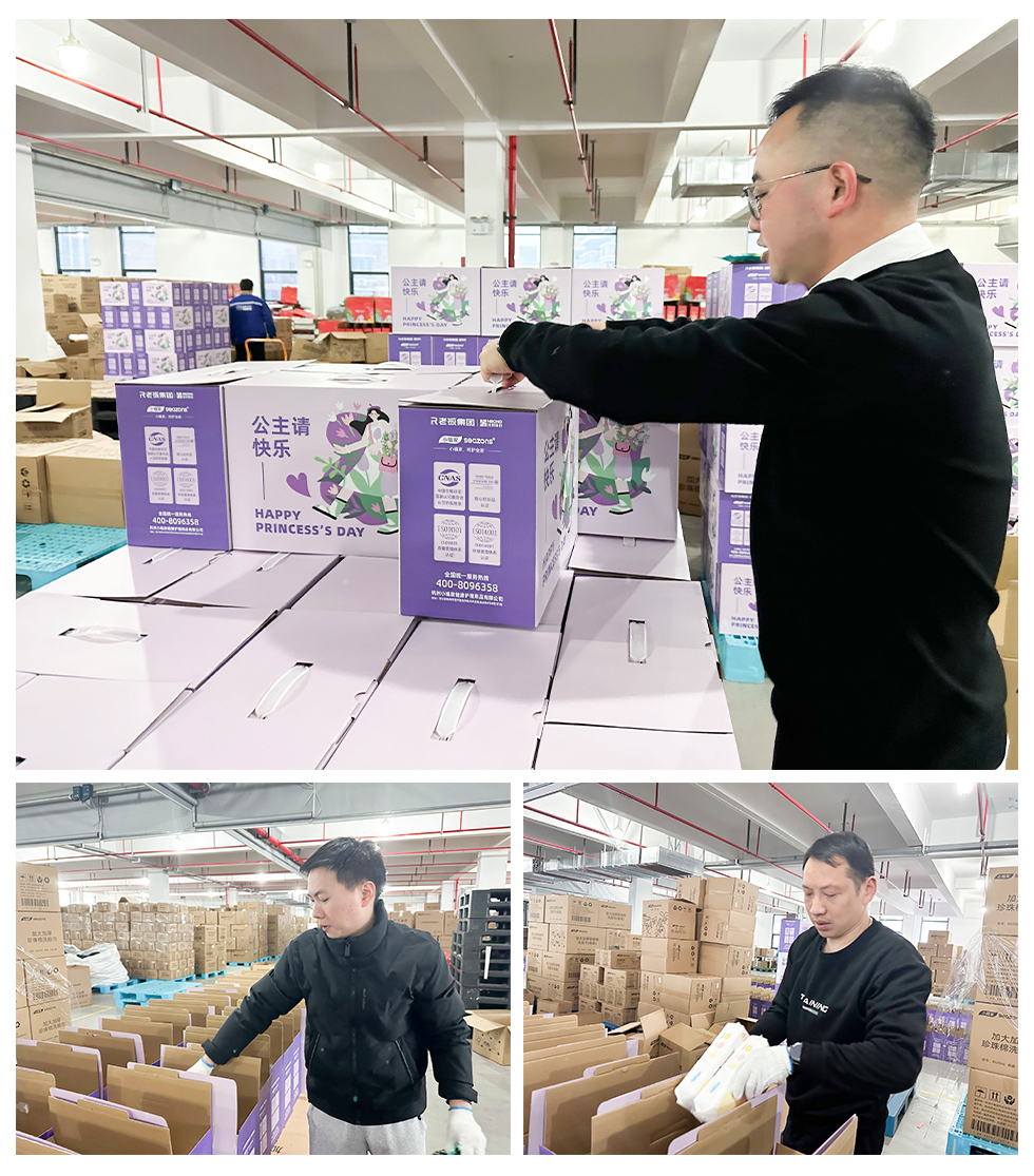 礼盒组装现场井然有序,折盒、装提手、装产品,尽管不是专业的生产人员,但所有人工作都一丝不苟,认真积极,在大家的共同努力下,最终礼盒在规定时间内完成组装,静静得等待在节日活动当天发放到各位女同胞手中。