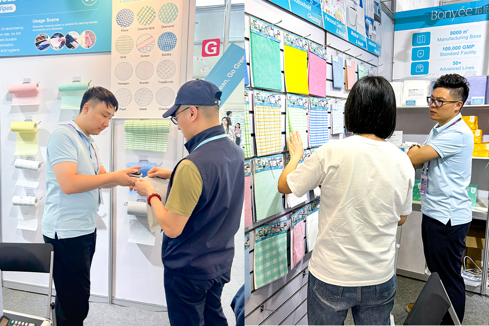 展会期间,我司展位接待了诸多来自中东、沙特等国采购商,他们在了解抹布的同时,更感兴趣个护类洗脸巾、浴巾等产品,与我司销售进行深入沟通交流,这一信息也反映出中东市场对个护产品新需求的提升。
